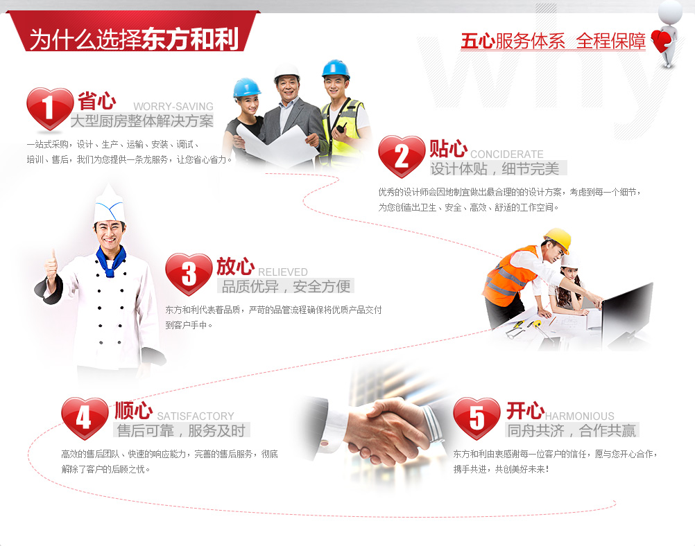 廚房工程建設(shè)是一項(xiàng)龐大復(fù)雜的系統(tǒng)工程,既需要與后勤工作人員、廚師溝通協(xié)調(diào), 又要與土建、裝修、機(jī)電、暖通等工程人員相互配合,工作量十分巨大。同時(shí)還要采購眾多的食品機(jī)械、工具,這對沒有相關(guān)經(jīng)驗(yàn)的我們來說確實(shí)是一個(gè)挑戰(zhàn)。有時(shí)候我們面對廚師提出的長長的采購需求清單就已經(jīng)眼花繚亂了。 幸好東方和利提供的是整體解決方案,從前期的設(shè)計(jì)咨詢到后期的安裝調(diào)試、從大型設(shè)備到餐具小件,包括各種食品機(jī)械,排煙通風(fēng),這些瑣碎事情都由東方和利來完成,為我們提供量身定制的解決方案。一站式采購為我們節(jié)省了大量精力,而且所有廚具都由東方和利來保修,對我們來說也更加方便。總之,東方和利的服務(wù)讓我們非常省心,我很滿意。